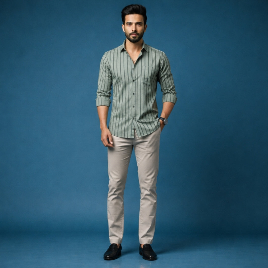 Men’s Smart Casual Outfit | Olive Green Black Stripe Cotton Satin Shirt + Beige Cotton Satin Chinos | Slim Fit Premium Combo