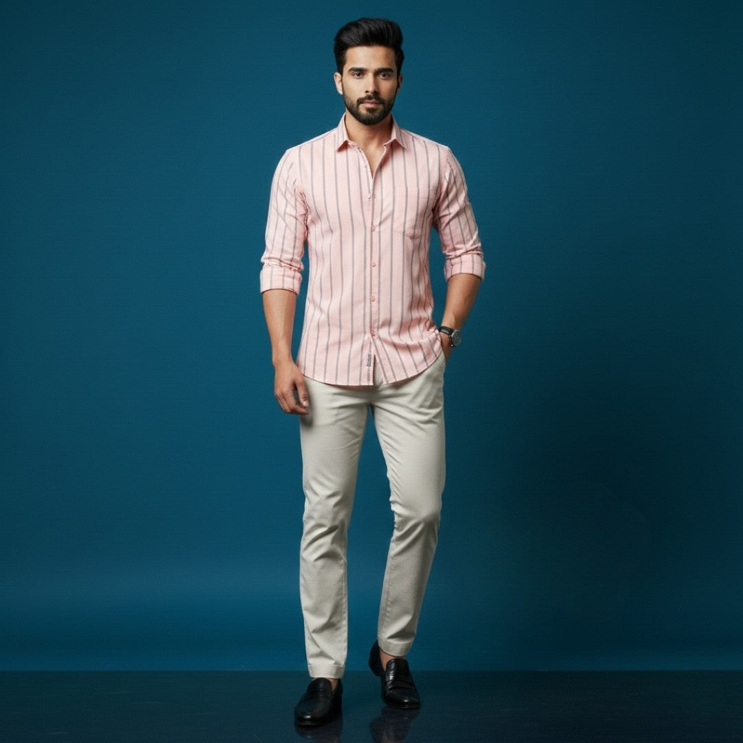 Men’s Peach Stripe Cotton Satin Shirt | 100% Cotton | Round Neck with Collar | Smart Casual Wear