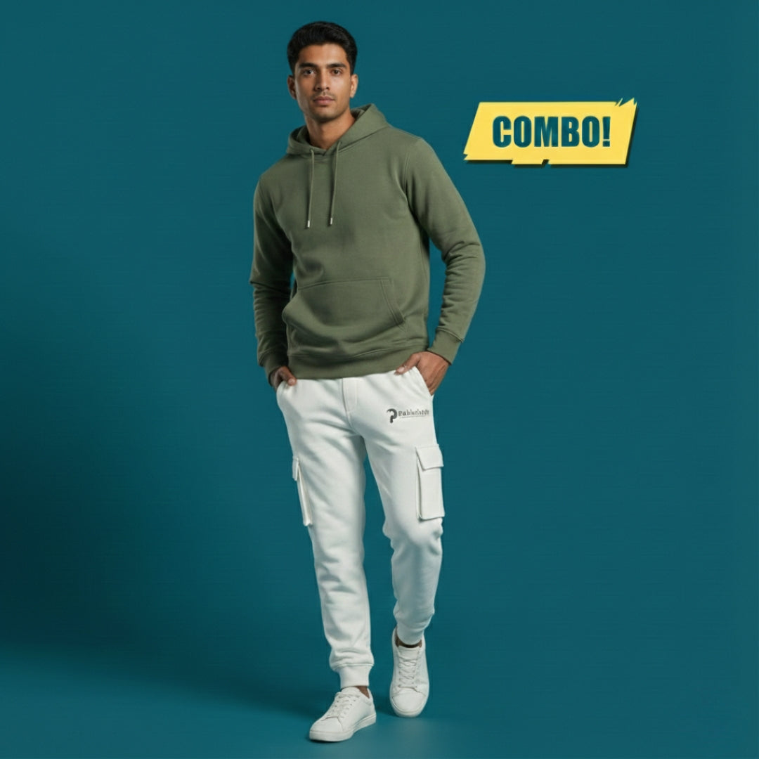 Army Green Hoodie & White Jogger Combo | Heavyweight Winter Outfit for Men