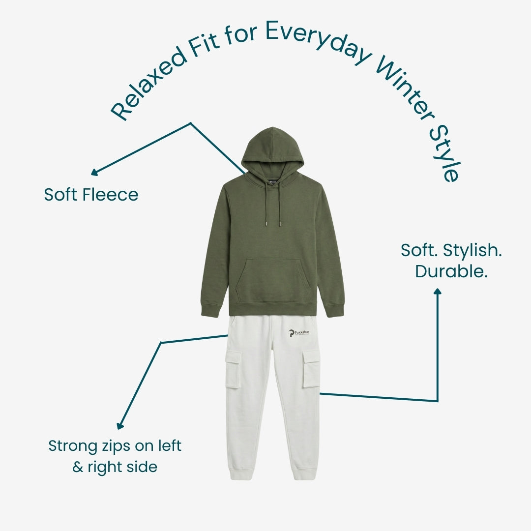 Refresh your winter style with the Army Green Hoodie & White Jogger Combo, a premium men’s winter outfit designed for comfort, warmth, and effortless everyday wear. Made using heavyweight cotton-enriched fleece (340–350 GSM), this combo delivers reliable insulation while remaining soft, breathable, and comfortable throughout the day.