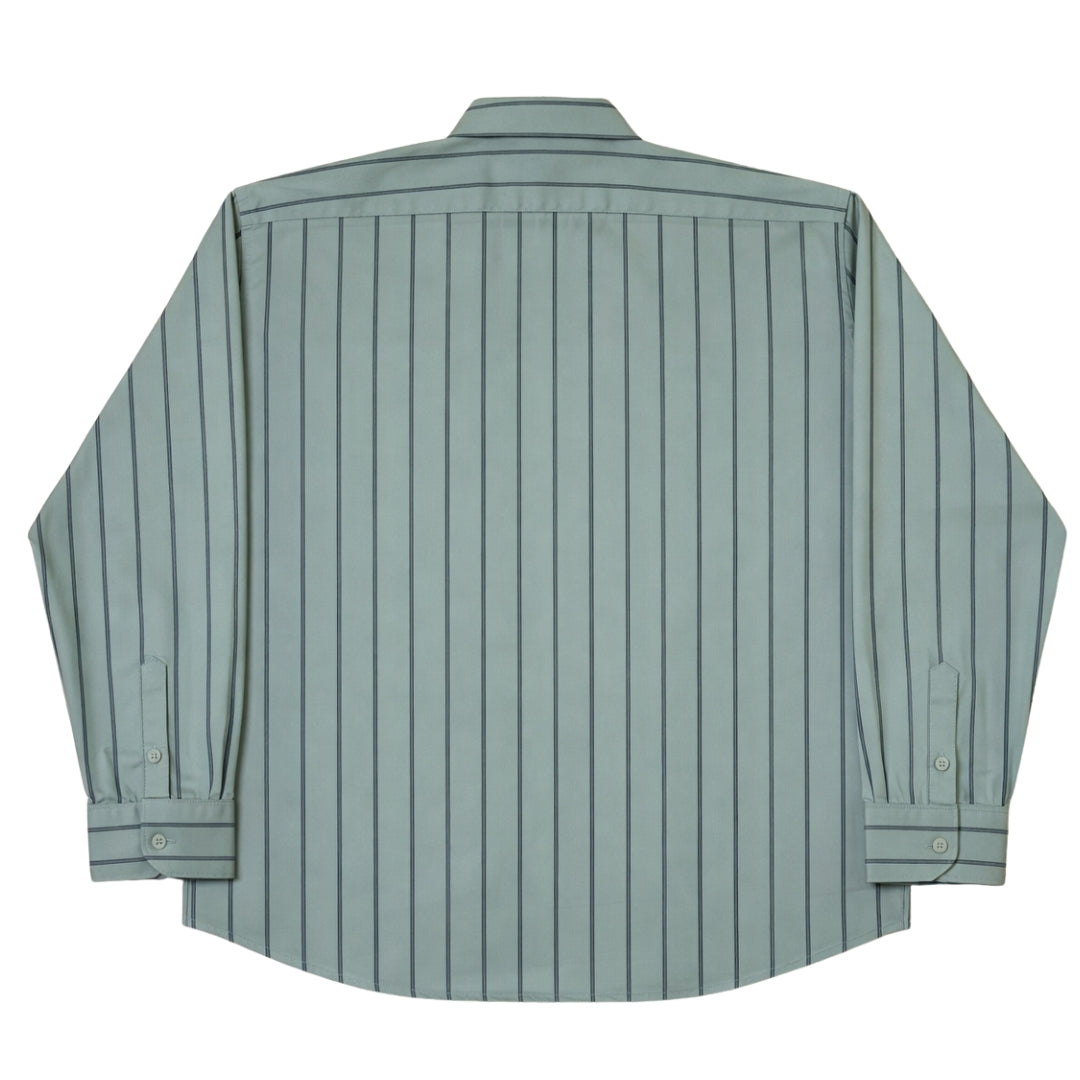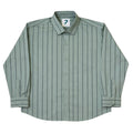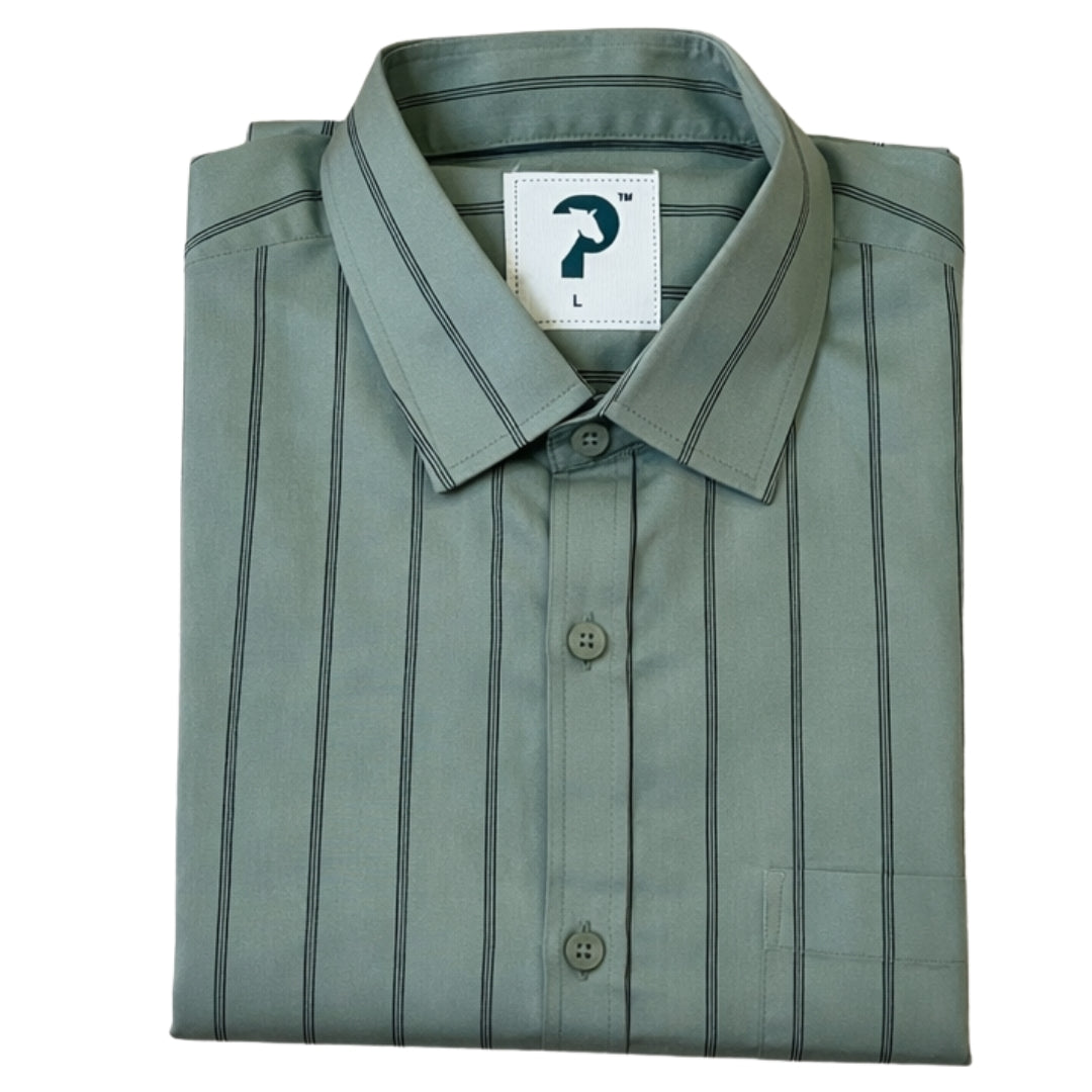 The shirt is crafted from 100% cotton satin fabric, offering a smooth texture with a subtle sheen for a refined appearance. The green base with black vertical stripes adds a classy, elongating look, while the round neck with collar delivers a modern take on a classic silhouette.