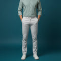The chinos are made from premium cotton satin fabric (350 GSM, 100% cotton), offering durability with a polished finish. Designed with 3–4% stretch elasticity, they provide excellent comfort and flexibility while maintaining a slim-fit tailored look. The off-white / cream color pairs effortlessly with the striped shirt.