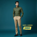 Men’s Smart Casual Outfit | Olive Green Oxford Cotton Shirt + Beige Cotton Satin Chinos | Slim Fit Premium Combo
