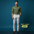 Made from premium cotton satin fabric (350 GSM, 100% cotton), these chinos offer durability with a smooth, polished look. The 3–4% stretch elasticity ensures ease of movement, while the slim-fit silhouette keeps the outfit sharp and tailored. The off-white / cream shade pairs seamlessly with the olive green shirt.