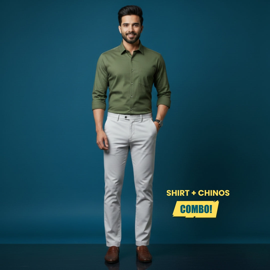 This combo pairs an Olive Green Plain Oxford Cotton Shirt with Off-White Cotton Satin Chinos, offering a refined color combination that works perfectly for office wear, casual meetings, and relaxed outings.